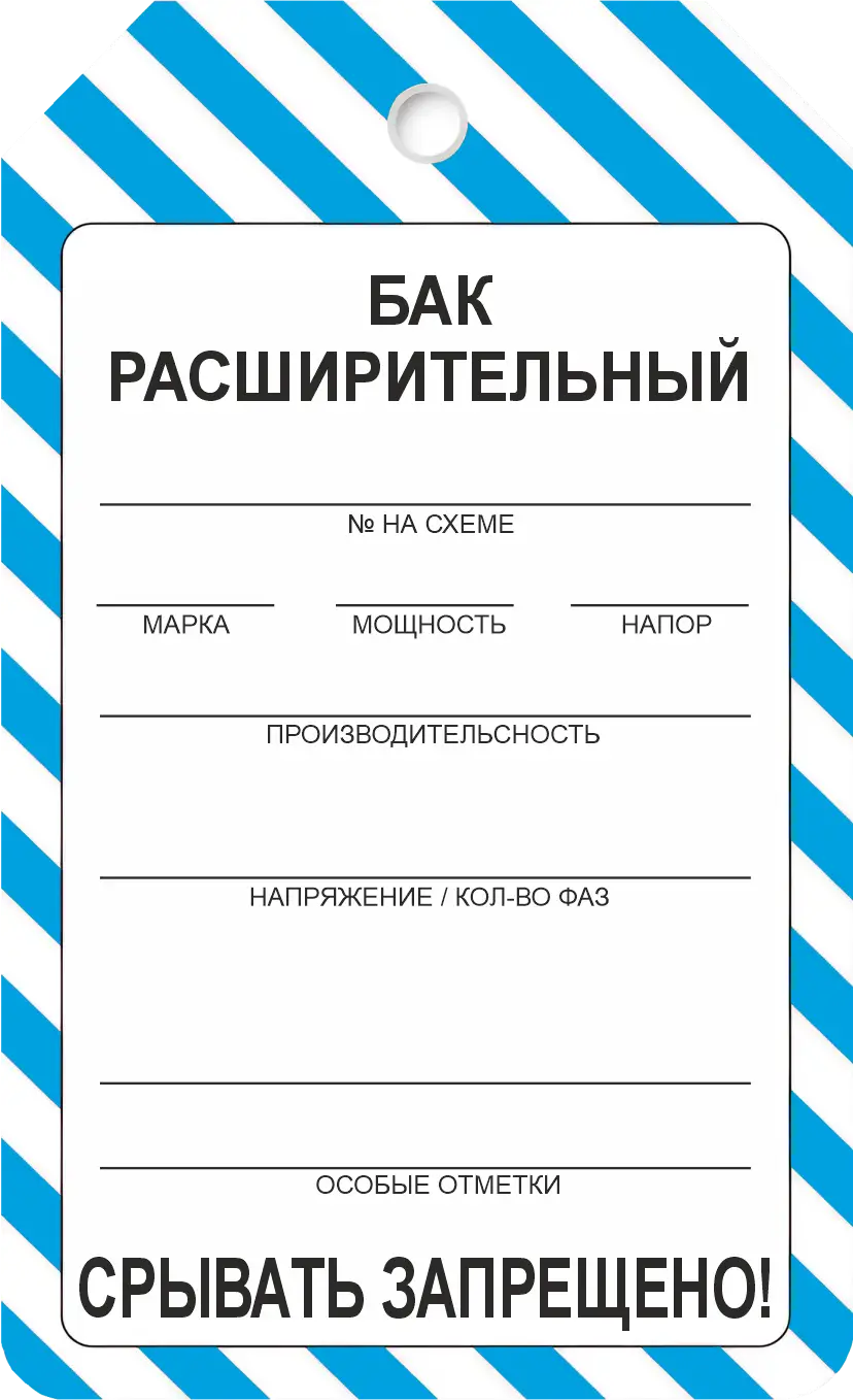 Информационная бирка "Бак расширительный" используется для маркировки оборудования, трубопроводной, газопроводной арматуры, стояков и КИП.