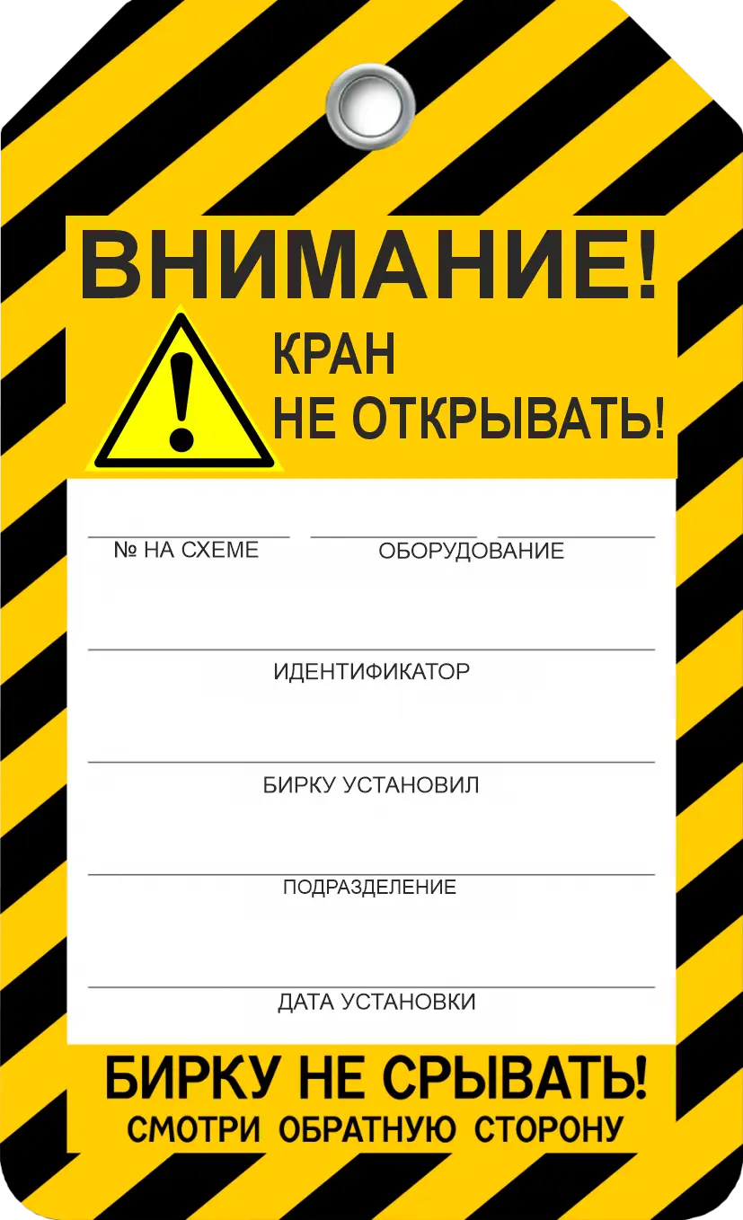 Информационная бирка " Кран не открывать" — предупреждающая табличка, которая размещается на объектах и оборудовании. Она привлекает внимание персонала, сообщает о постоянной или временной опасности и запрещает небезопасные действия.