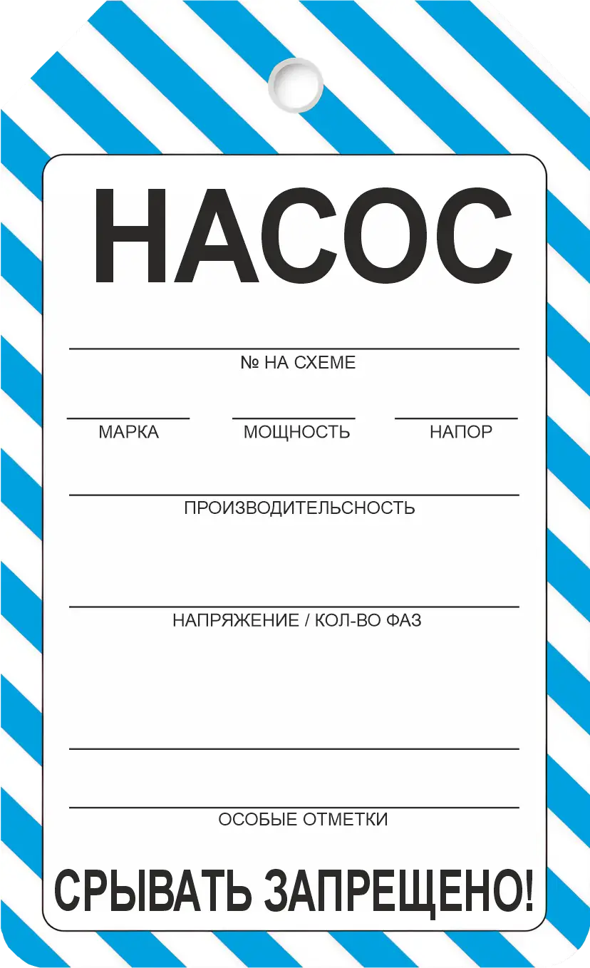 Информационная бирка "Насос" содержит основные технические характеристики оборудования, такие как мощность, напряжение, производительность, частота вращения и другие параметры.