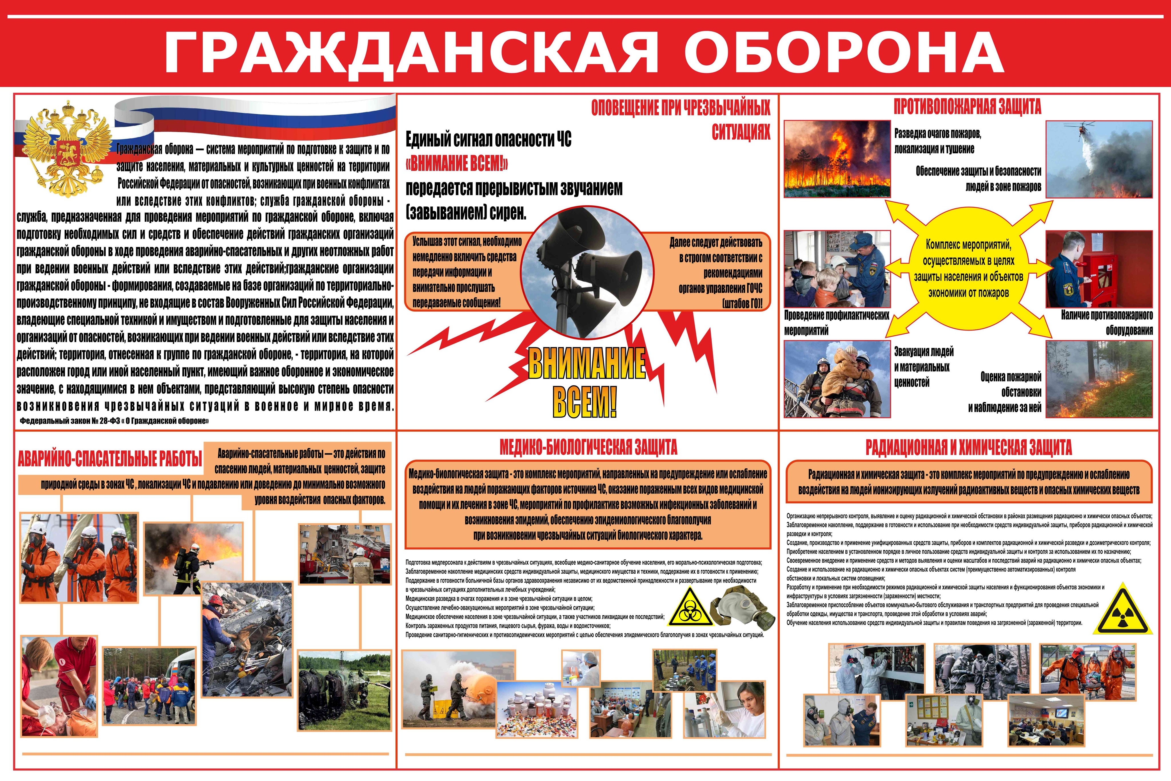 Стенд «Гражданская оборона» — наглядное пособие с инструкциями о действиях в чрезвычайных ситуациях (при авариях, катастрофах, обрушениях, радиоактивном заражении и др.). Содержит схемы, правила поведения и контакты экстренных служб. Предназначен для информирования и обучения населения мерам безопасности.