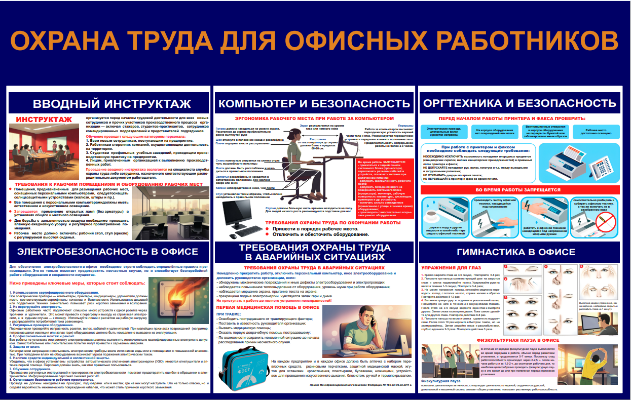 Информационный стенд «Охрана труда для офисных работников 2» — это эффективный инструмент повышения уровня безопасности персонала на рабочем месте. С его помощью вы обеспечите сотрудников необходимой информацией по охране труда, профилактике профессиональных рисков и безопасному выполнению рабочих обязанностей. Помогает избежать несчастных случаев, снизить количество травм среди сотрудников и повысить производительность труда. Создайте здоровую и безопасную рабочую среду уже сегодня!