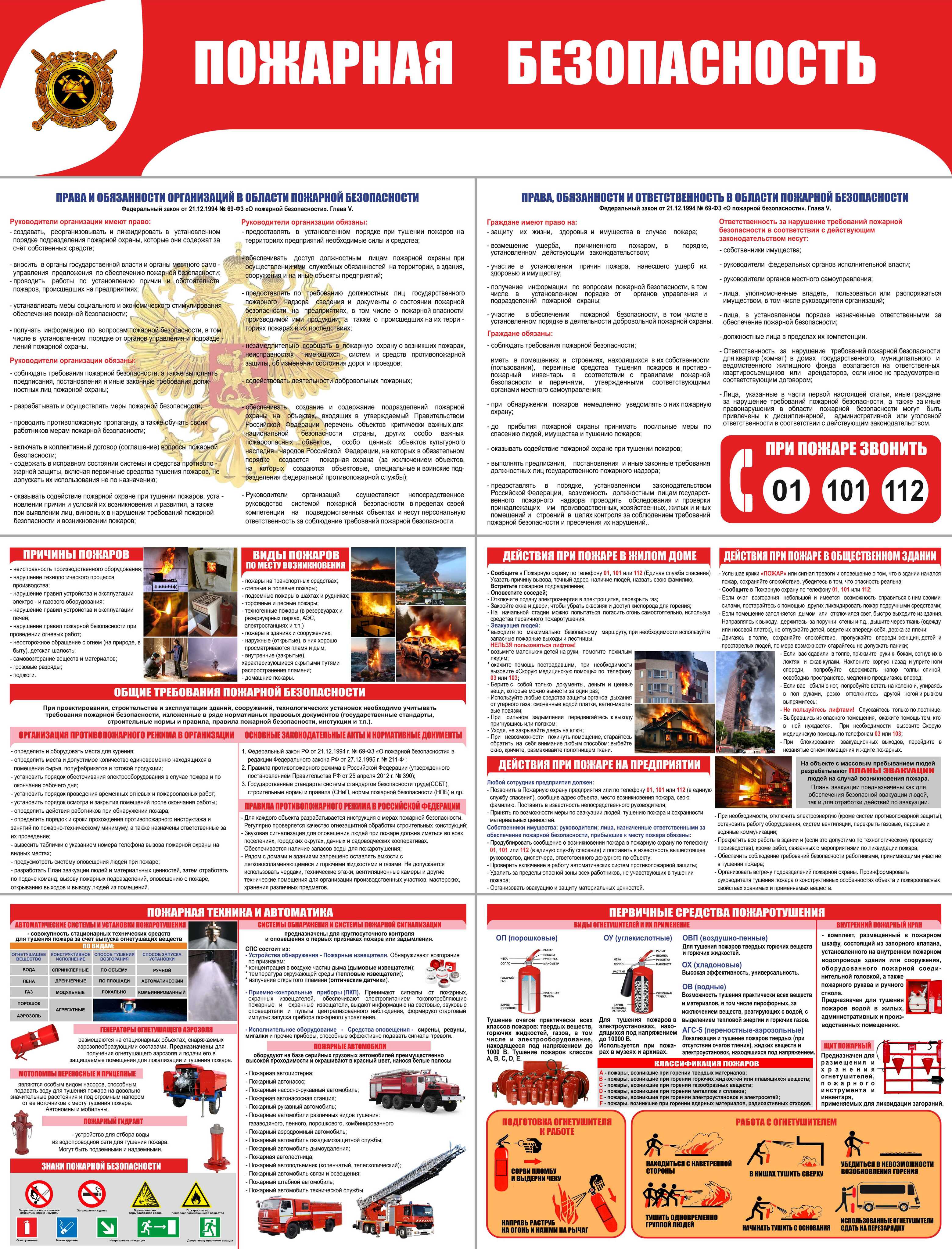 Профессионально оформленный информационный стенд размером 800х1050 мм, освещающий ключевые аспекты пожарной безопасности. Преимущества: - Повышает уровень осведомленности сотрудников и посетителей о мерах предосторожности; - Соответствует требованиям к информированию по охране труда; - Улучшает имидж компании как ответственного работодателя/организации; - Легко интегрируется в любой интерьер офиса, учебного заведения или общественного пространства.