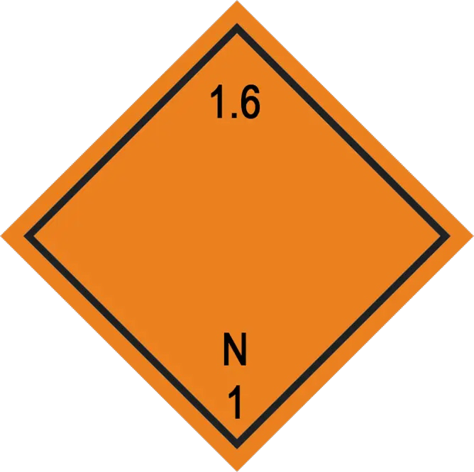 Знак Класс 1. Подклассы 1.6 "Взрывчатые материалы" предназначен для обозначения взрывчатых материалов, которые по своим свойствам могут взрываться, вызывать пожар с взрывчатым действием, а также устройств, содержащих взрывчатые вещества и средства взрывания.