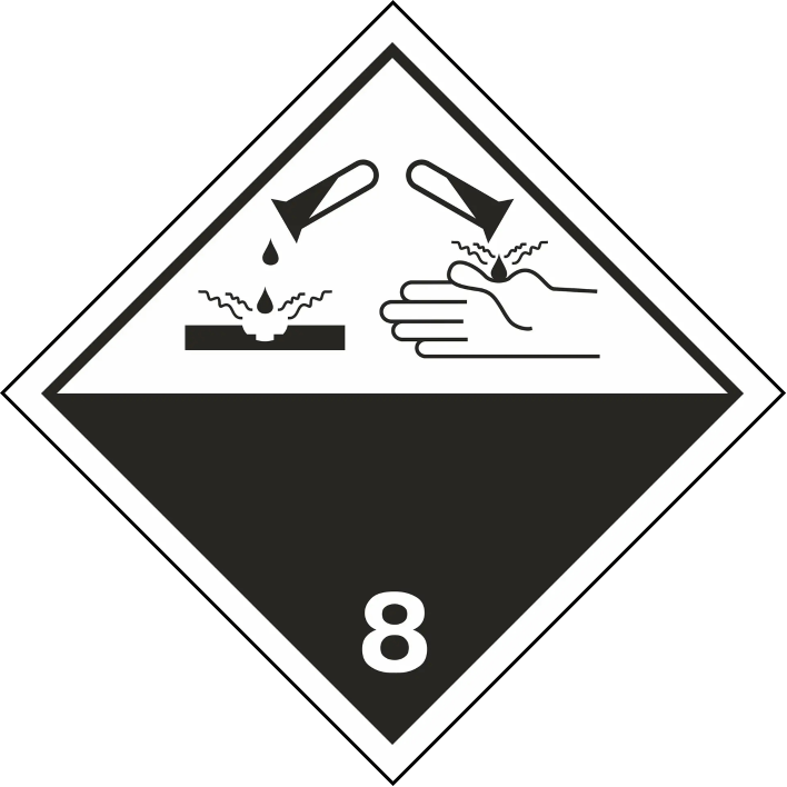Знак Класс 8 "Едкие (коррозионные) вещества" используется для обозначения веществ, которые могут вызывать разрушение кожи, металлов и других материалов при контакте. Такие вещества представляют значительную опасность для здоровья и инфраструктуры.