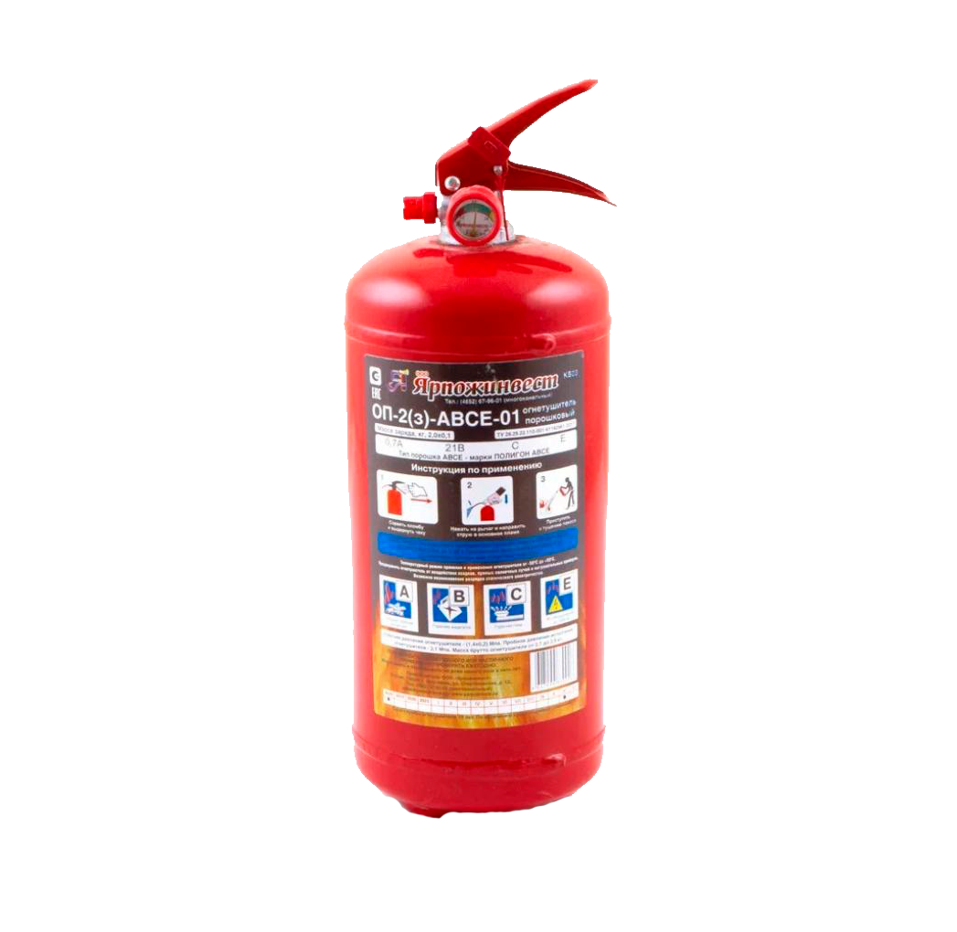Огнетушитель порошковый ОП-2 Ярпожинвест (г. Ярославль) - универсальный переносной огнетушитель закачного типа. Масса заряда огнетушащего вещества - 2 кг. Ранг по модельным очагам: 0,7А, 21В, С, Е (до 1000В).