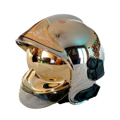 Шлем-каска ШКПС золотого цвета — средство индивидуальной защиты пожарного. Предназначено для защиты головы, шеи и лица человека от механических и термических воздействий, агрессивных сред, поверхностно-активных веществ (ПАВ), воды при тушении пожаров и проведении аварийно-спасательных работ, а также от неблагоприятных климатических воздействий.